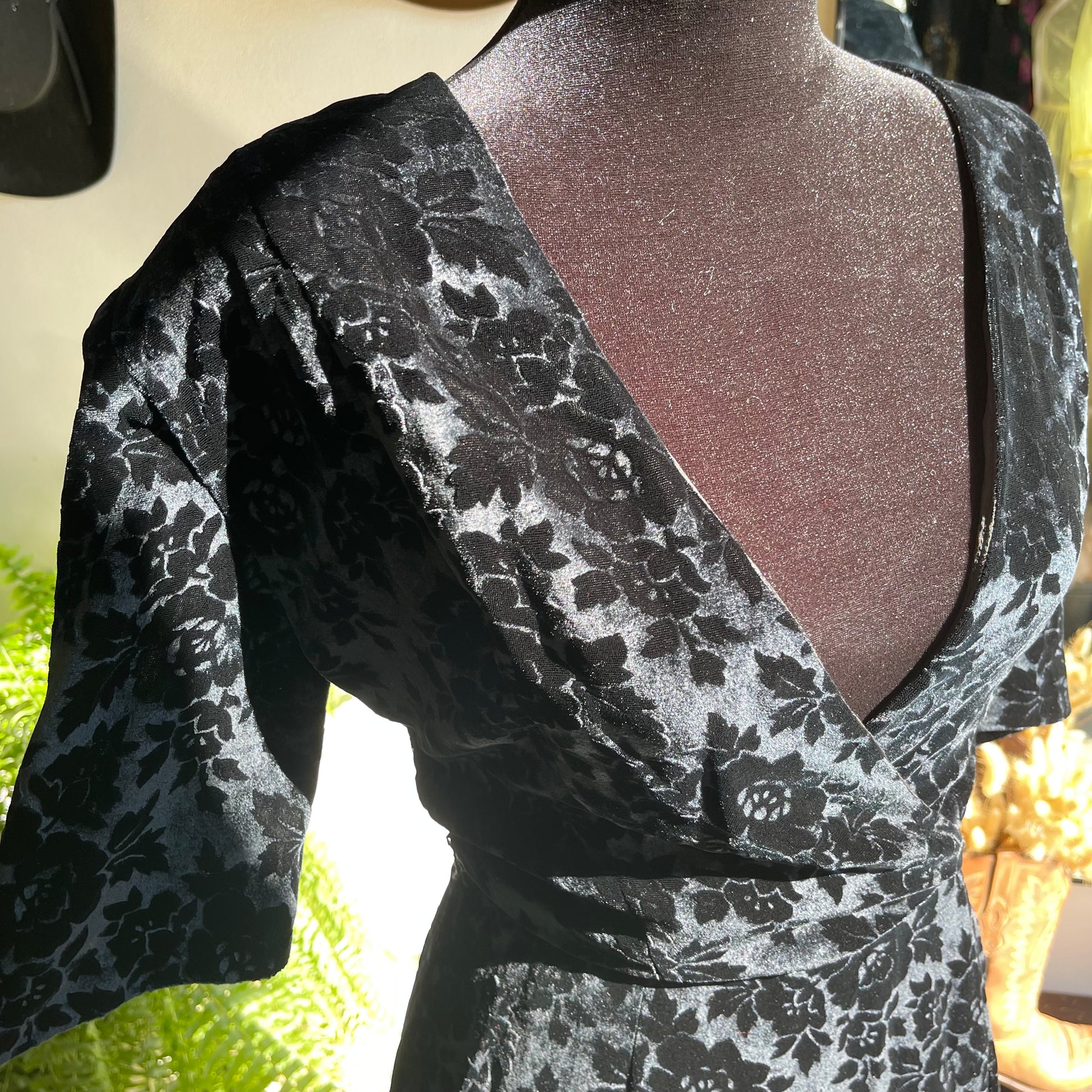 Vintage handmade velvet burnout dress in black appearing to be dating from the 30’s. Features slip-on styling with side zip closure, a v neck, modest below the knee length and shorts peeves with shoulder pads. Pristine condition. Dry clean only. Pit to pit flat 17.5 inches, waist flat 13.5 inches, pit to bottom hem 38 inches.