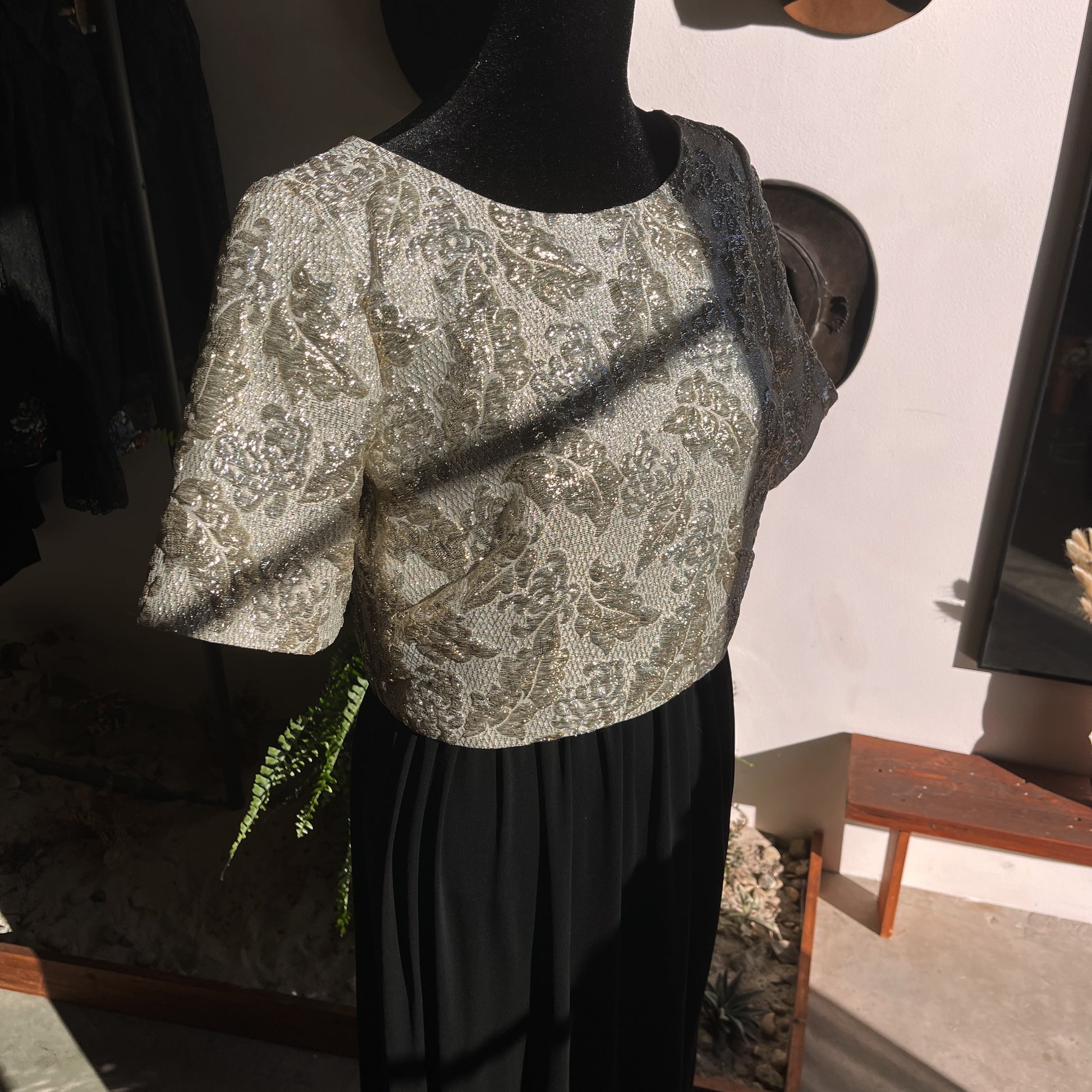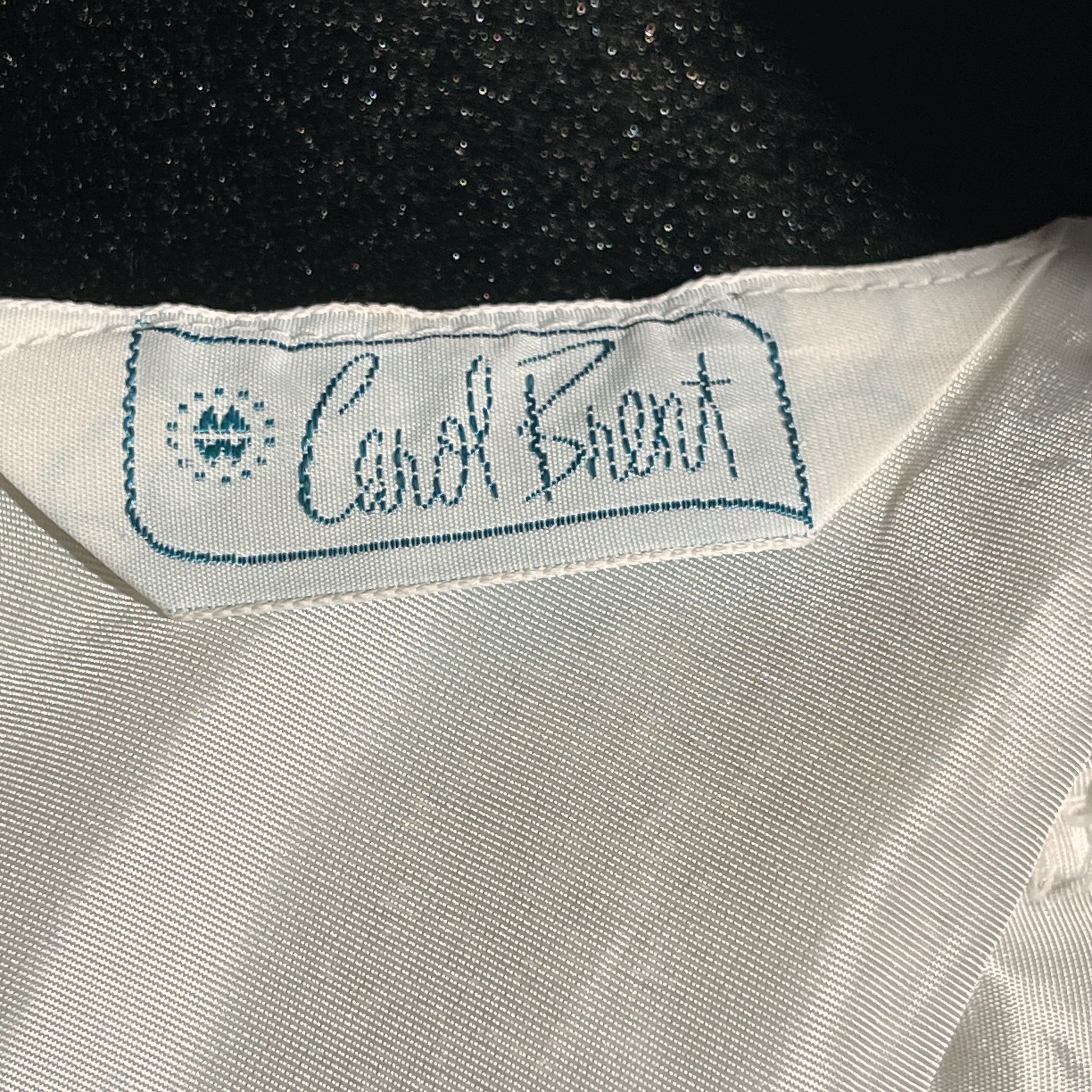 Style multiple ways! Beautiful metallic woven top by Carol Brent from the 60’s. Great condition, minor with to thread. Pit to pit flat 15 inches, shoulder to bottom hem 15 inches.