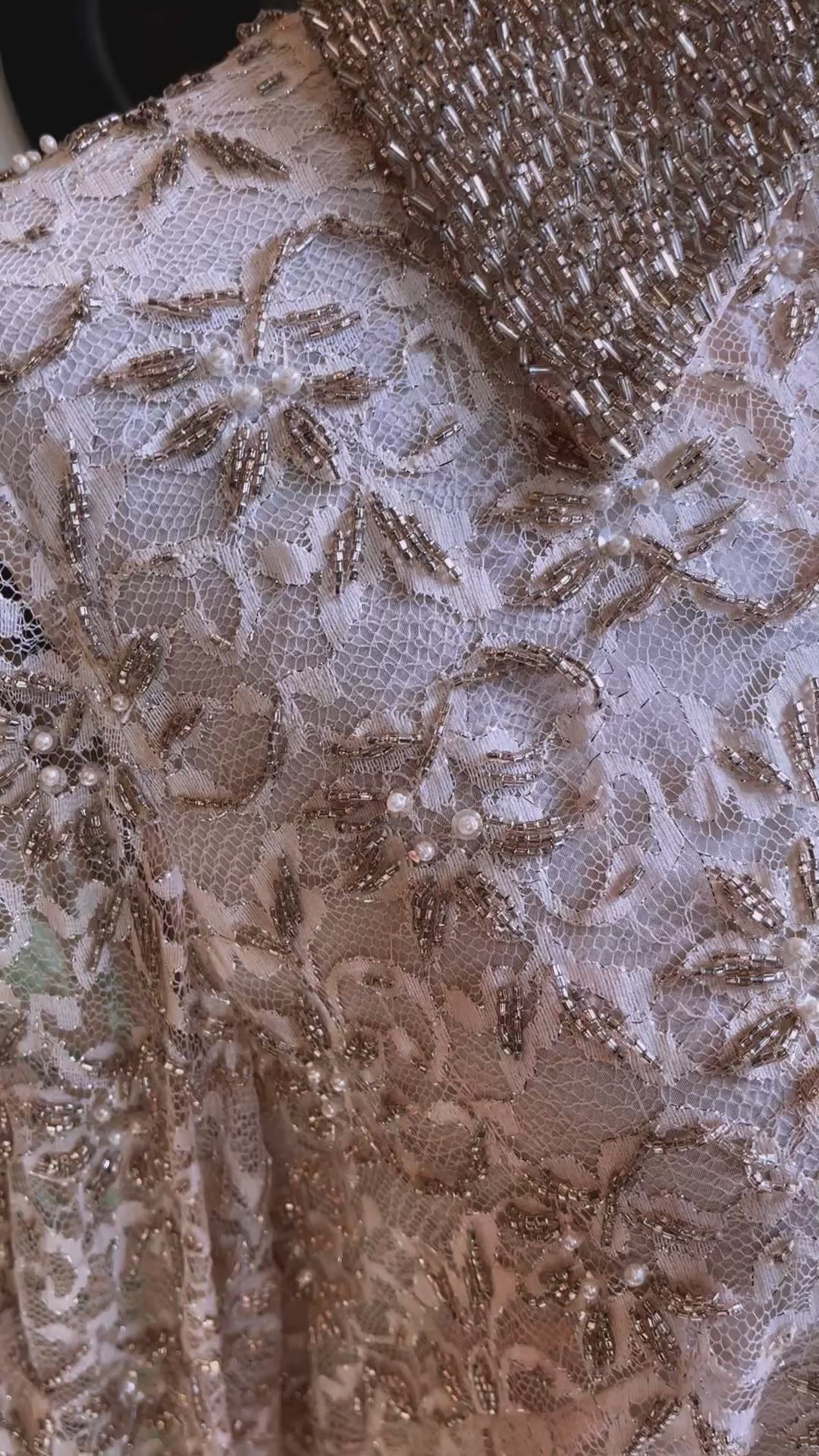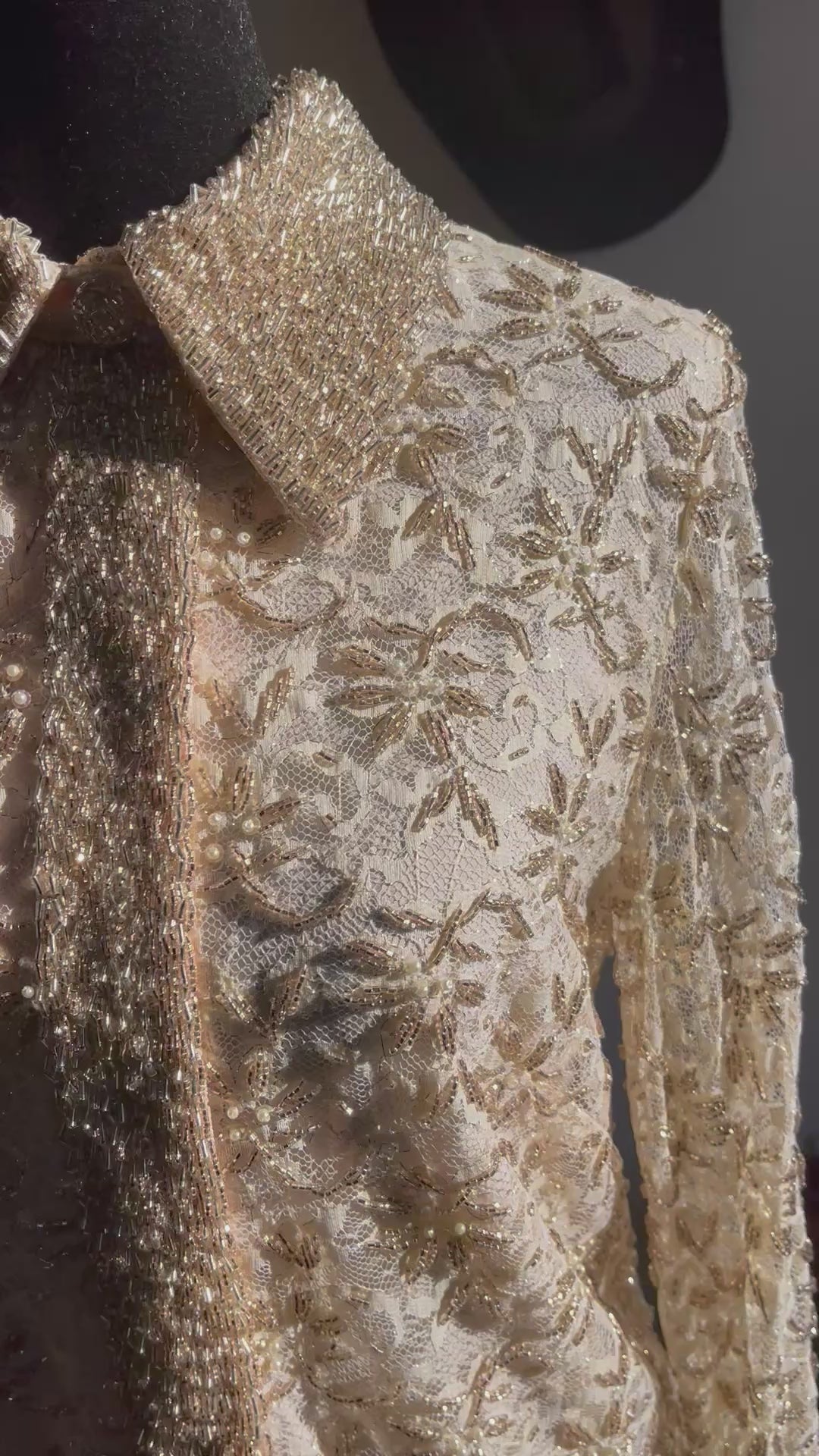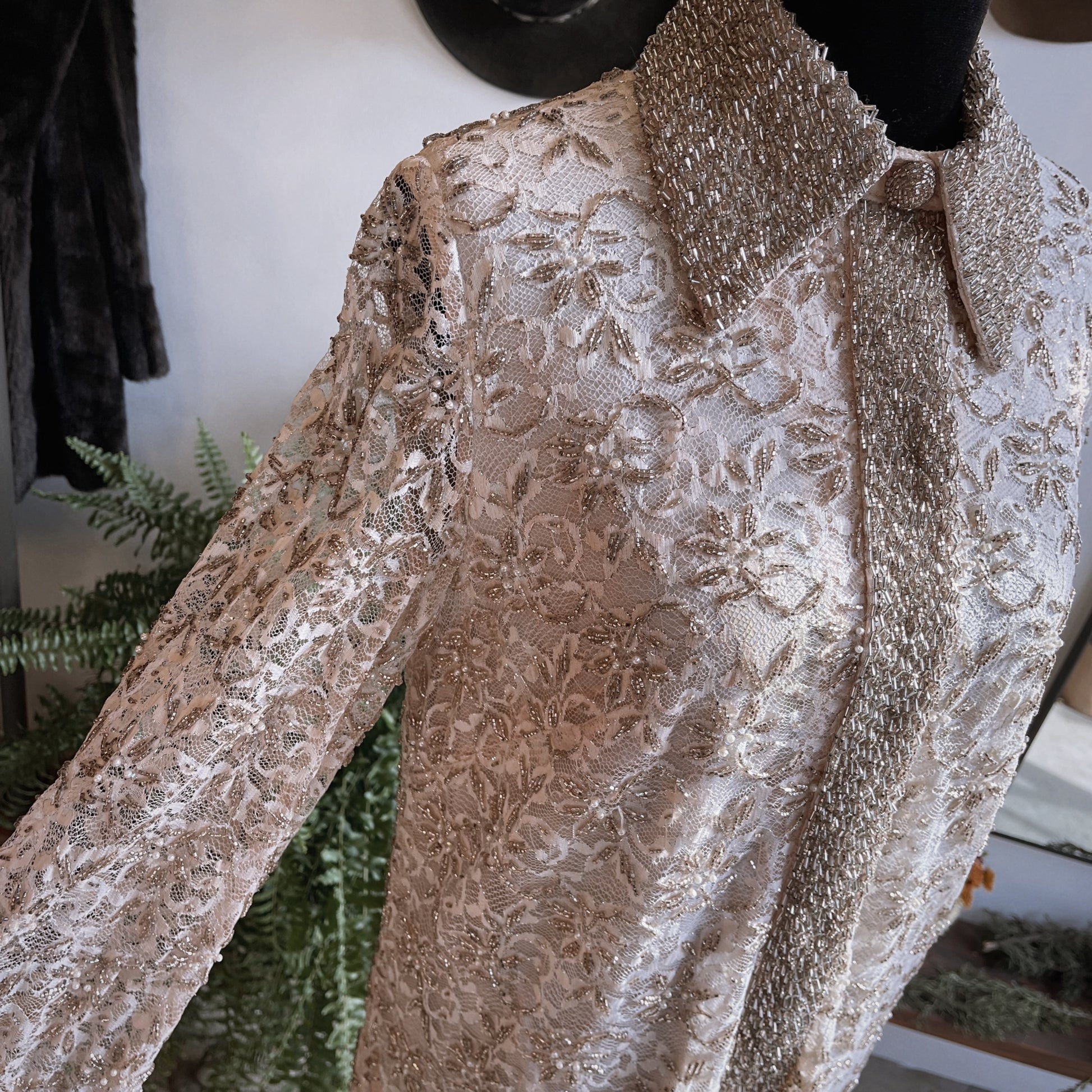 Vintage luxury- Couture lace beaded long sleeve dress with pearls. Collared with snap button closure and relaxed fit. Pristine condition. Pit to pit flat 17 inches, waist flat 16.75 inches, shoulder to bottom hem 38 inches.