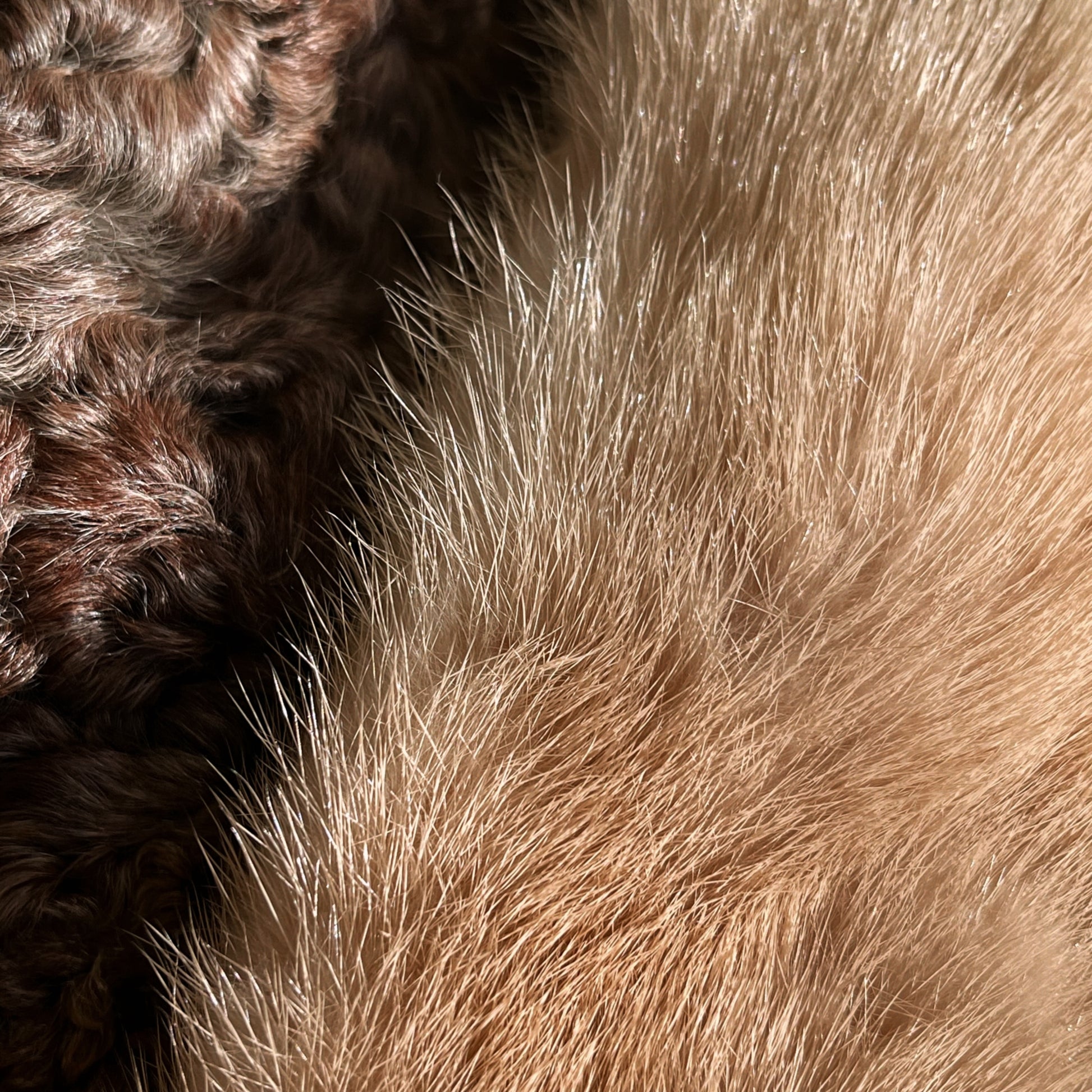 Vintage coat which we believe to be lamb and mink in brown and tan variants by Greenblatt’s estimated to be from the 60’s. Line with minor wear to interior lining. Outer fur is in great condition with 3/4 lot long length sleeves cuffed. Casual fit with hook closure at neck.