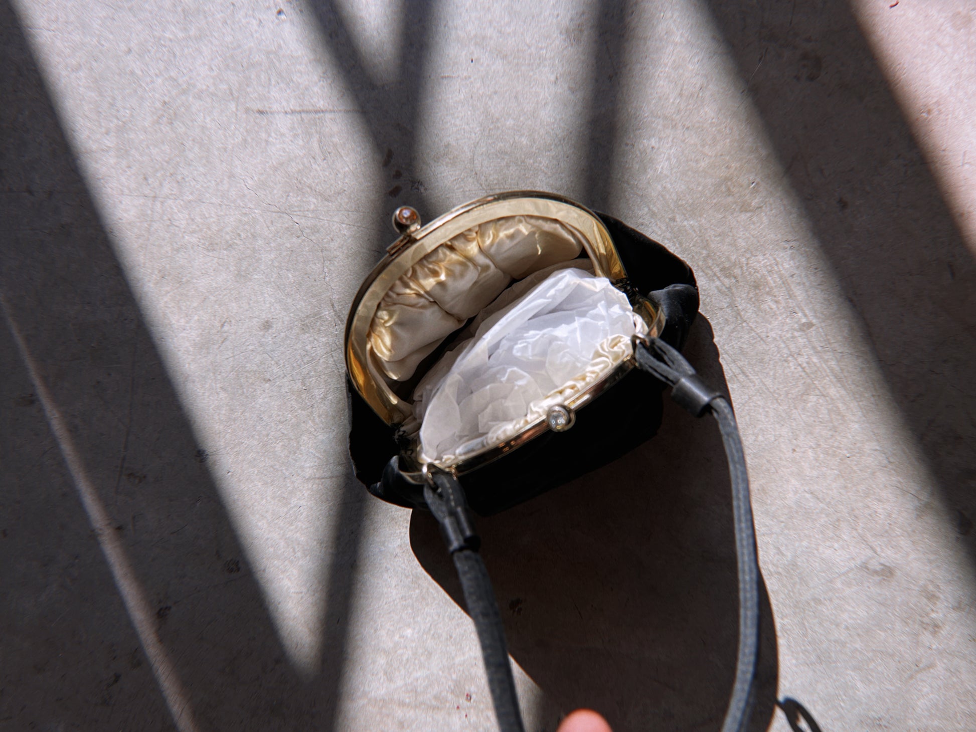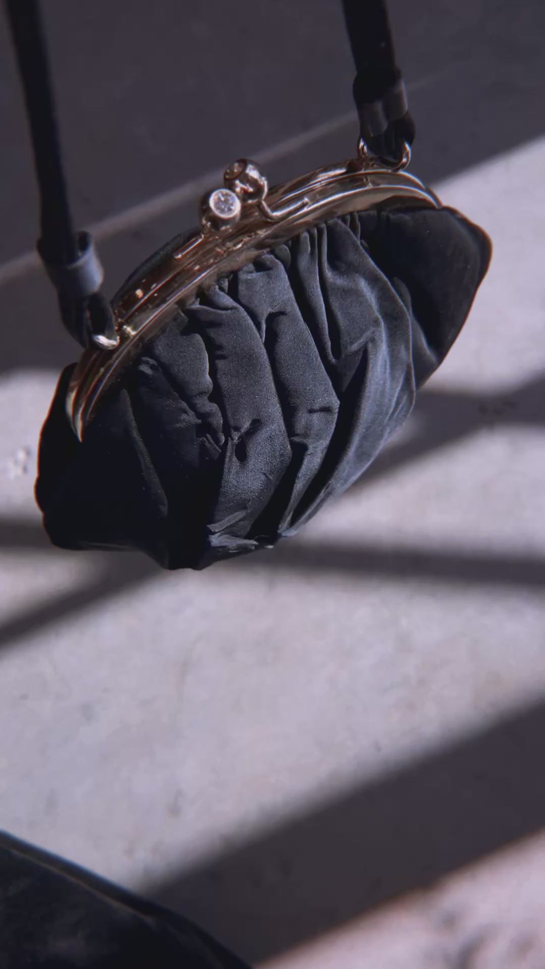 Vintage 1960’s clam shell purse in satin black with gold hardware and crystal mound at closure. Pristine condition. At tallest 6.5 inches and widest 7.75 inches.