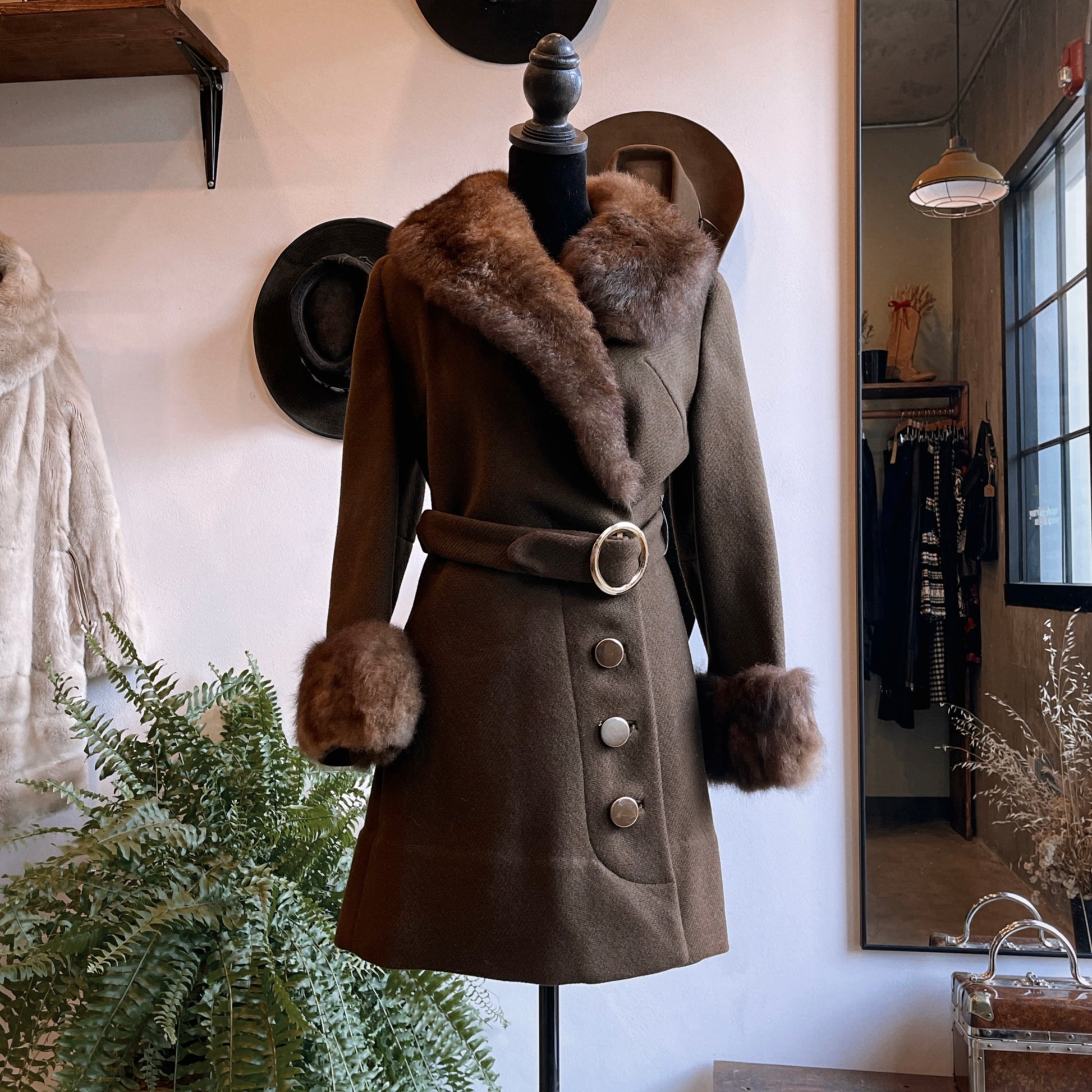 Vintage 1960s Penny lane style coat by petite Jr by Ruby Martin. Body is an olive brown color and made of wool with brown fur (unsure if style plush like rabbit). Featured gold hardware and waist belt. Pristine condition with no flaws. Professional clean only. Best for a modern 0 to 4 size. Pit to pit flat 16.75 inches, waist flat 16 inches, shoulder to bottom hem (length) 32.5 inches.