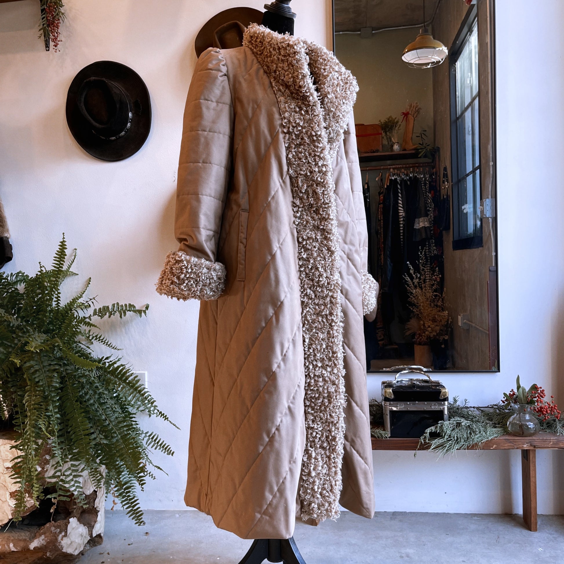 Vintage 60s Tissavel France x Rain Cheetahs New York quilted jacket with curly lamb fur acrylic in tan. Long length with hook closure through waist area, ski pockets and textured hems. Size 10. Like new, no flaws. Professional dry clean. Pit to pit flat 29.75 inches, shoulder to bottom hem 47 inches.