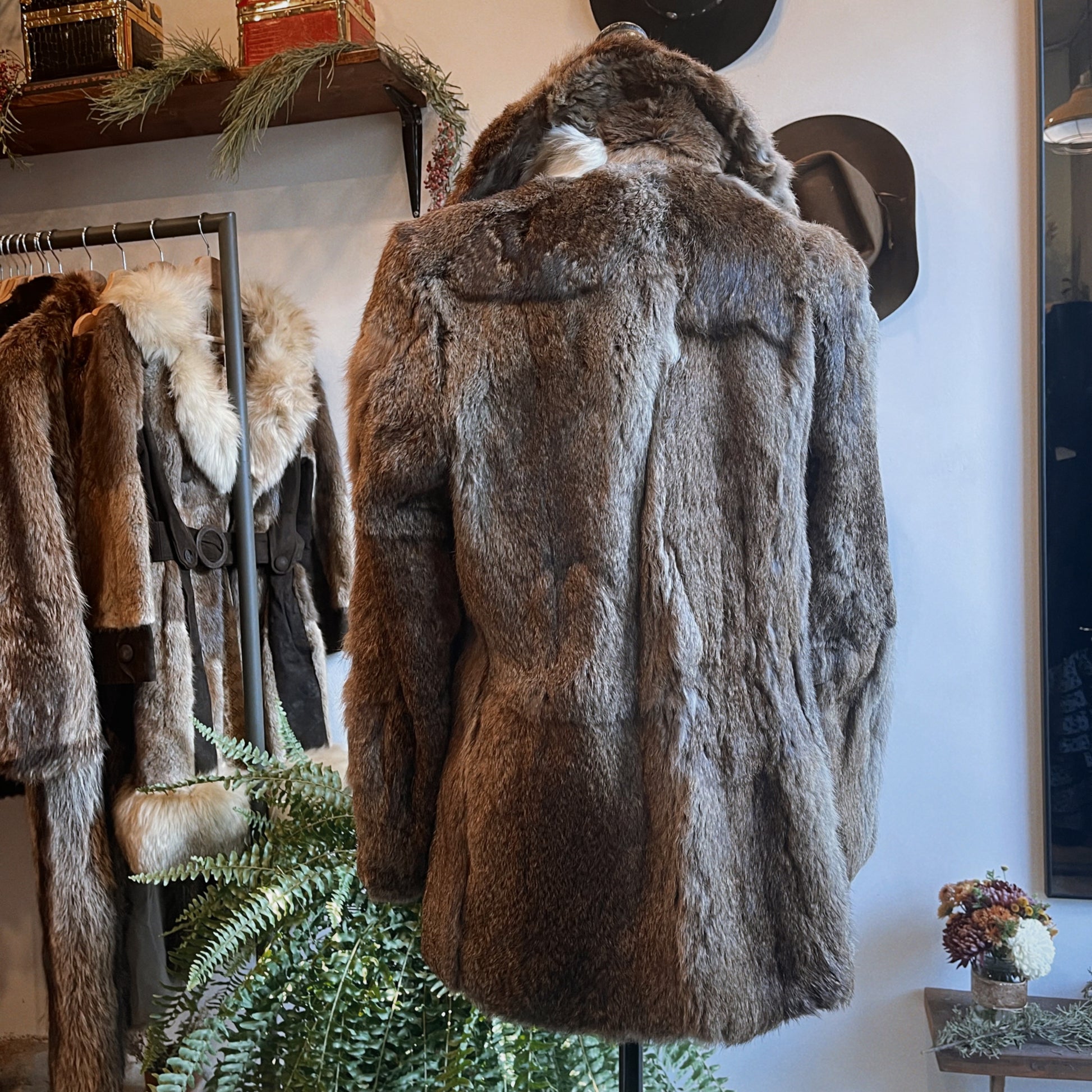 Vintage 1970s rabbit fur jacket by Jet Set of California is brown variants in open style with relaxed silhouette. Perfect condition, like new. Pit to pit flat 19 inches, shoulder to bottom hem 28 inches.