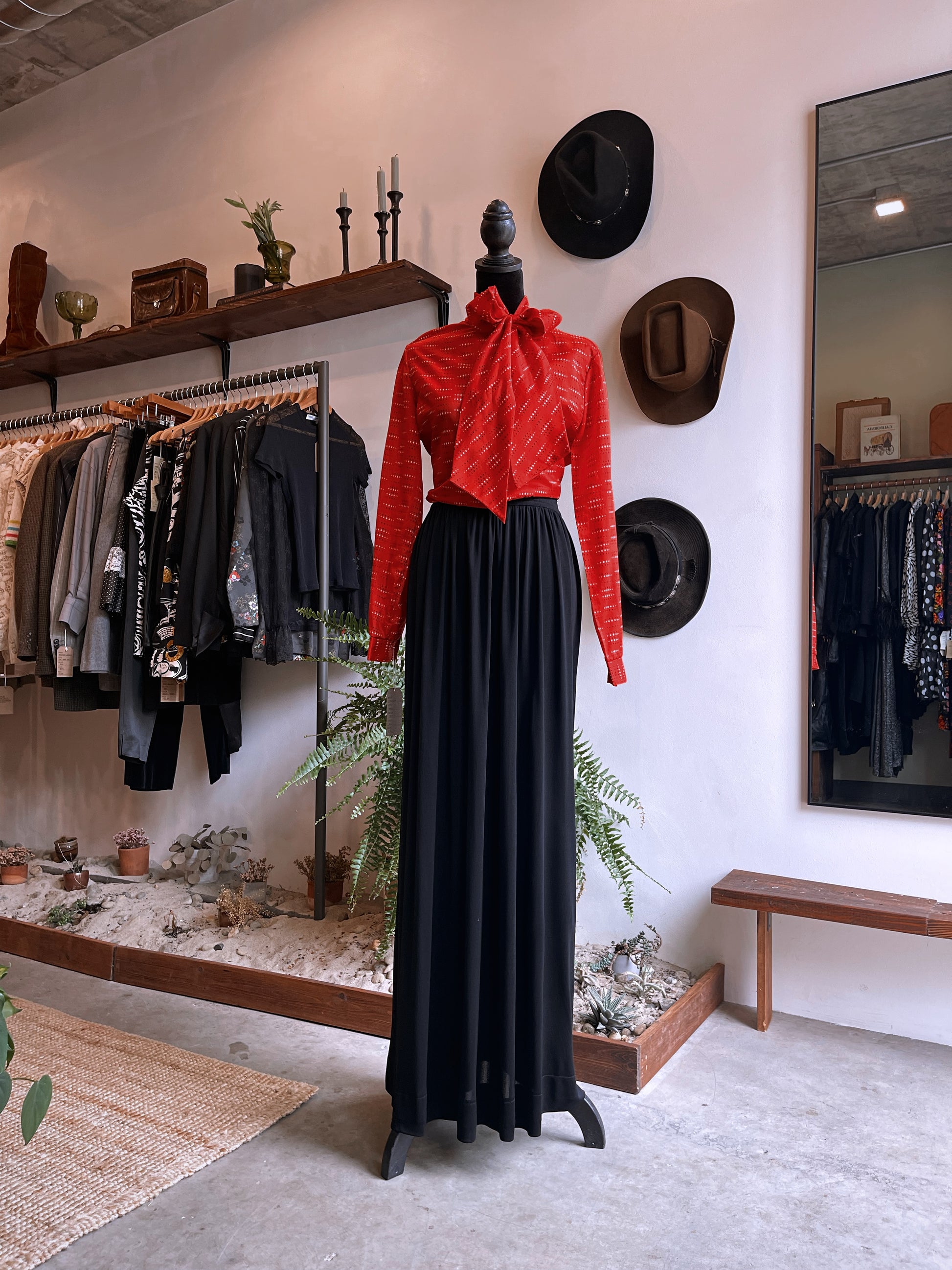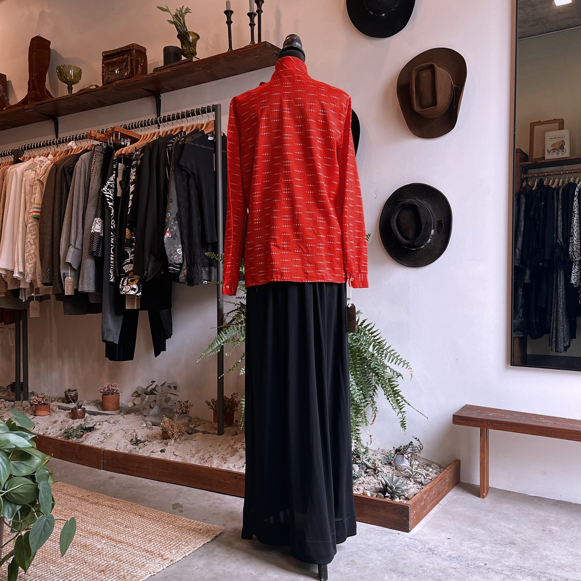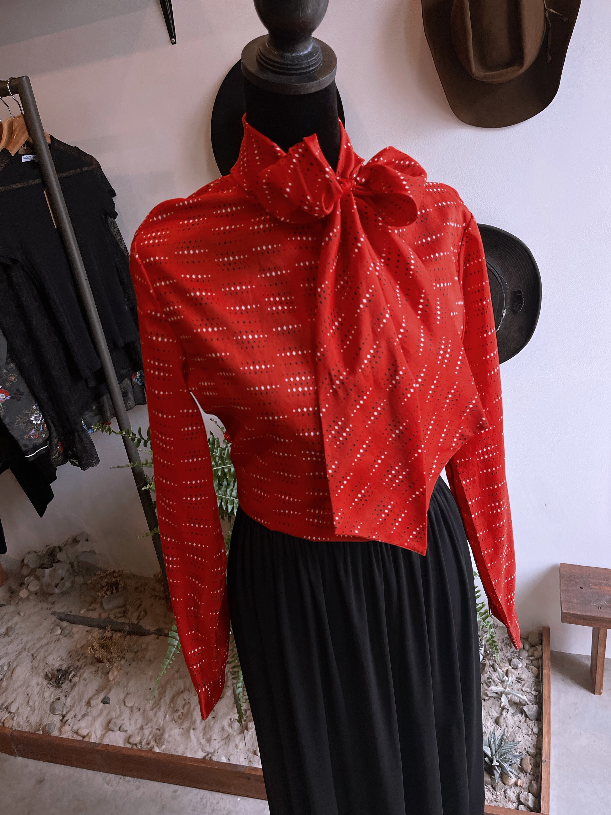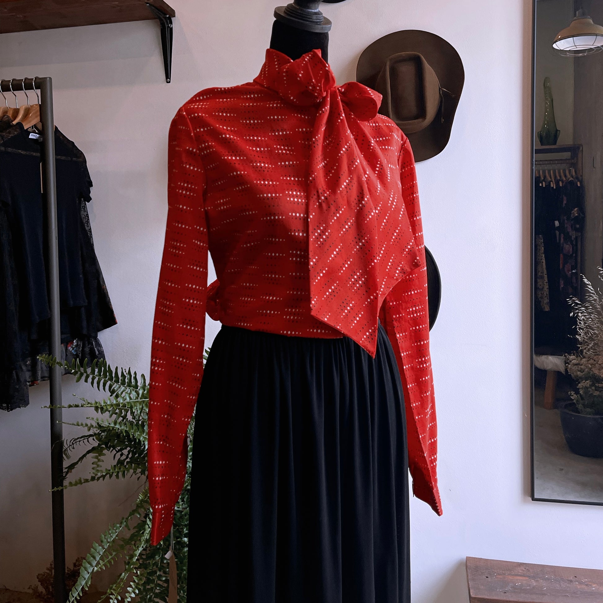 Vintage red blouse with neck tone and button closure from Country Suburbans from the 70’s. Pit to pit flat 19 inches, shoulder to bottom hem 28 inches. Labeled a size 12.