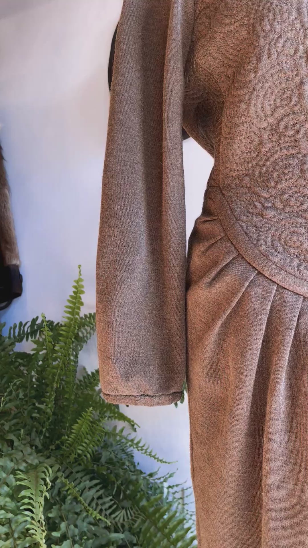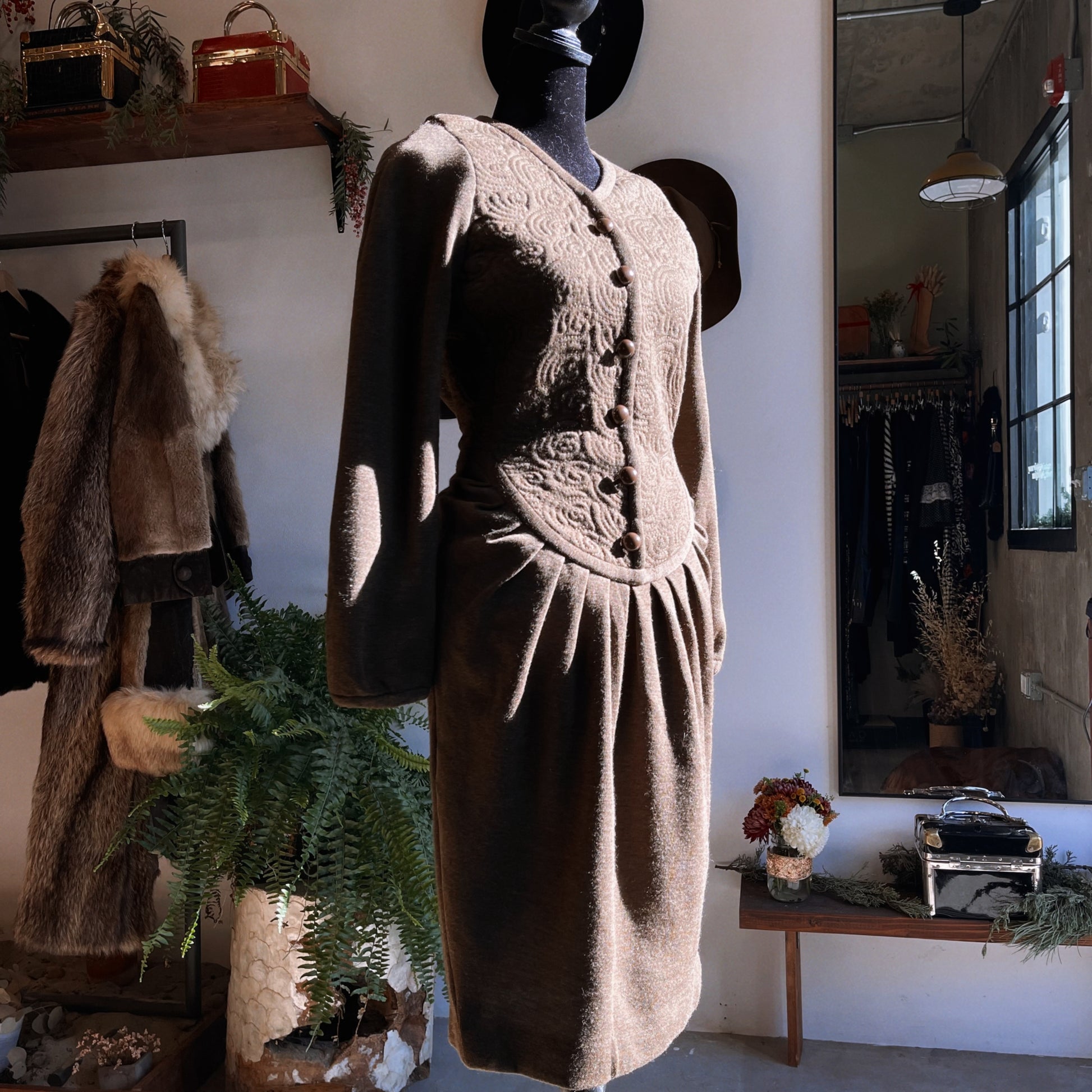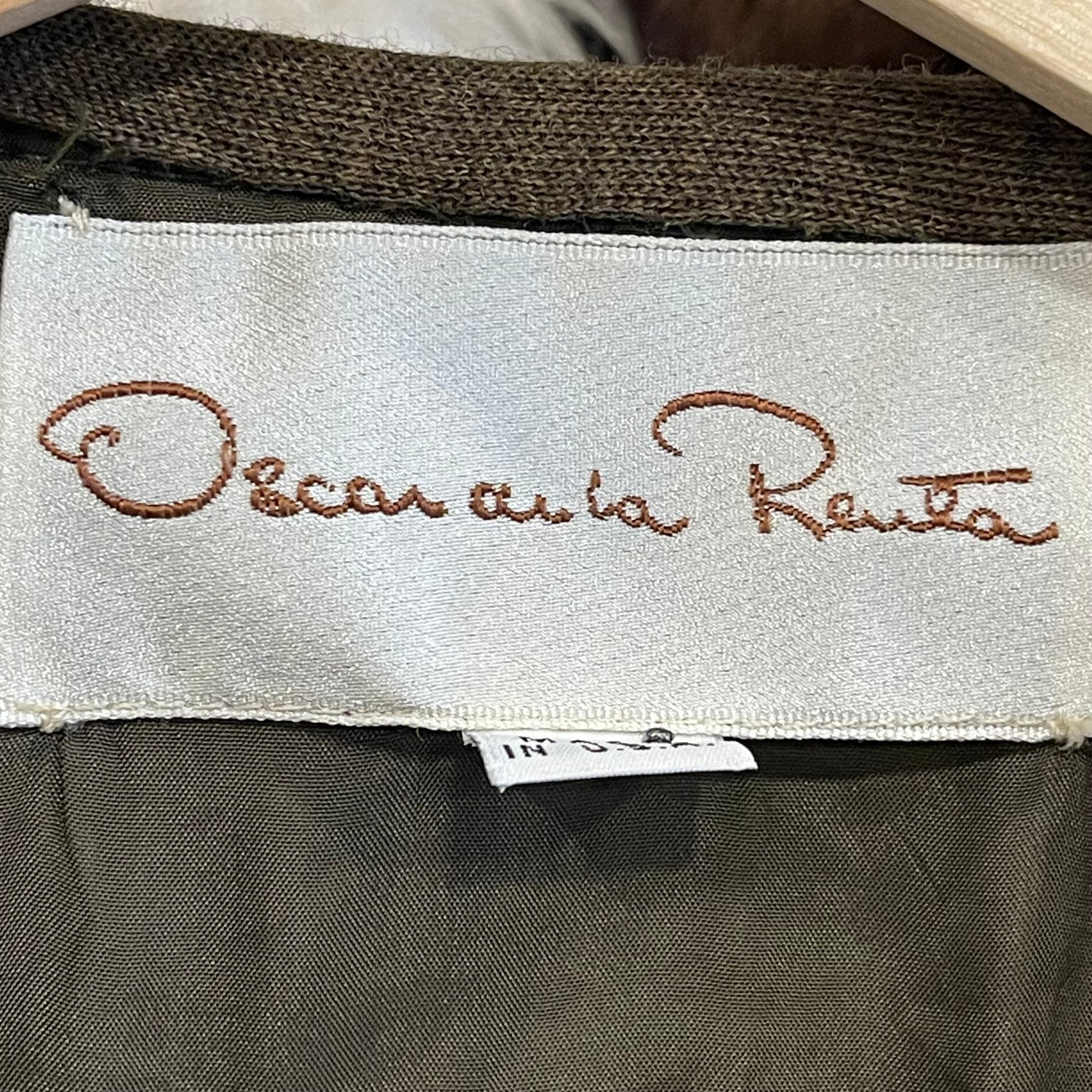 Vintage Oscar de la Renta wool embroidered dress in muted green featuring love sleeves, fitted waist, pleated hip area, front zip closure with buttons and subtle v neck. Size 4. Dry clean only. Like new condition. Pit to pit 15.5 inches, waist area 13 inches, shoulder to bottom hem 40 inches.