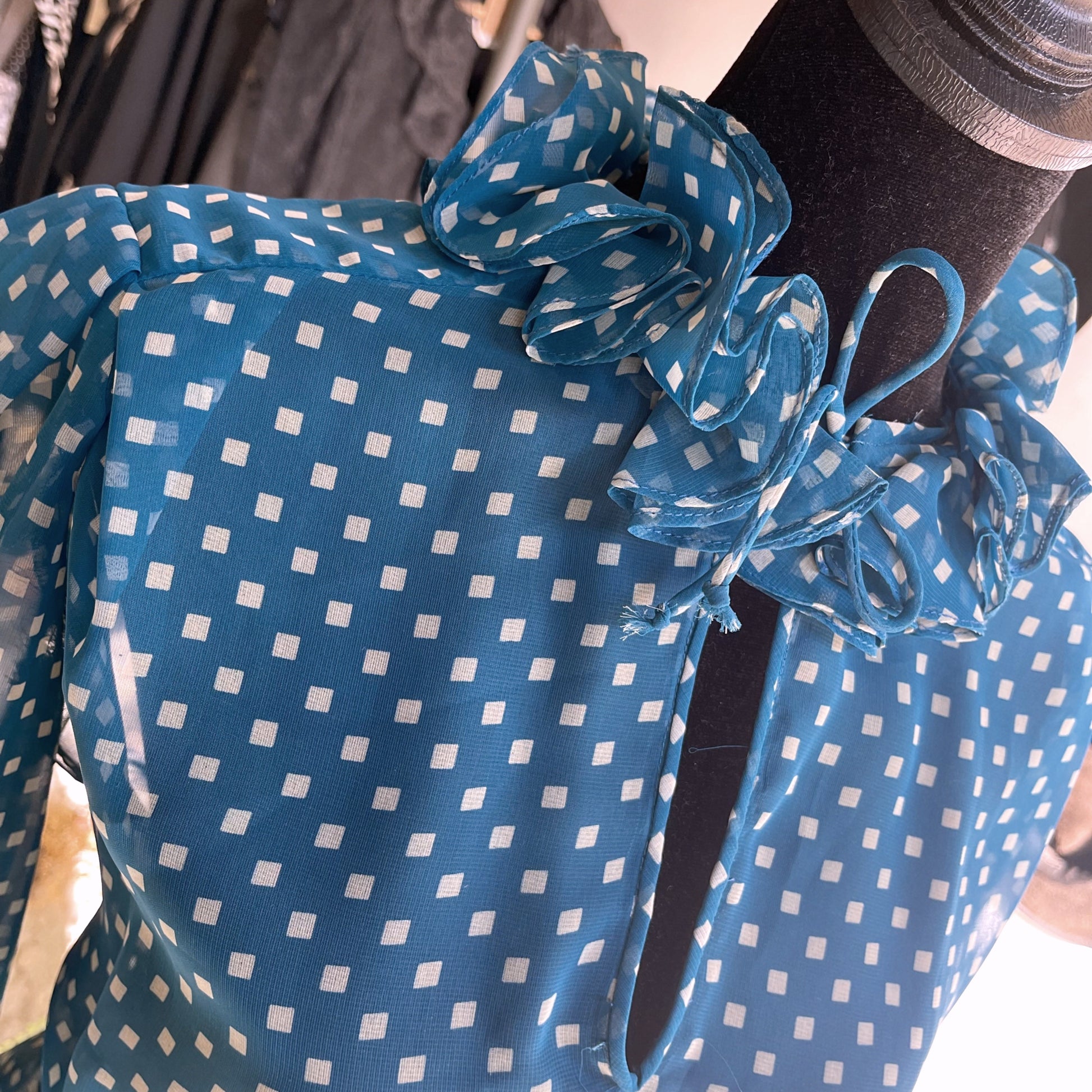 Vintage secretary style dress dating from the 1970’s by Delani. Features blouson long sleeves, mock ruffle neckline with optional closure tie, tonal waist tie, knee length and semi sheer polyester knit. Pristine condition.