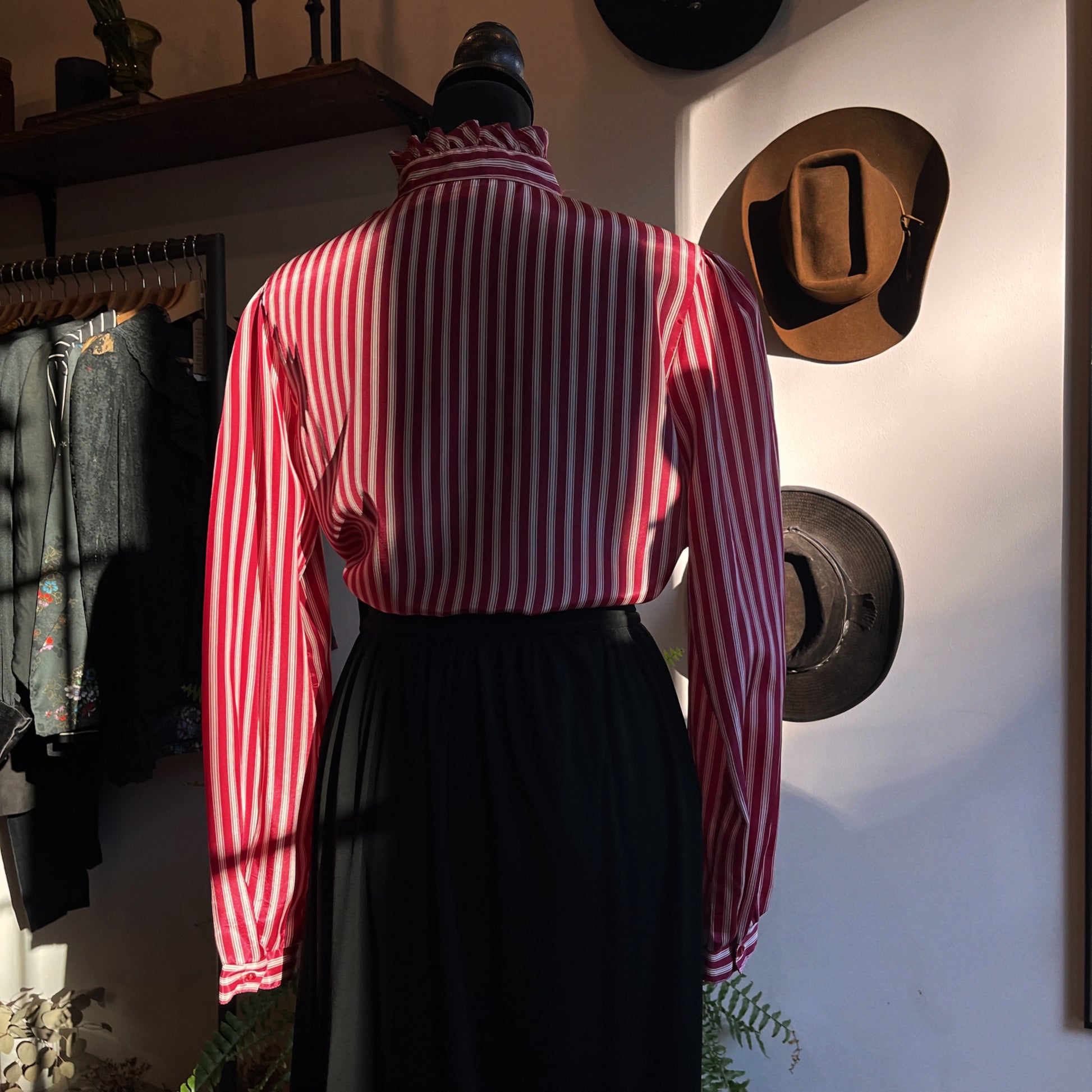 Vintage 80’s secretary blouse by Jonathan Martin in pink and white stripe with ruffle neck and long sleeves. Great condition. Made of acetate blend. Pit to pit flat 20 inches, shoulder to bottom hem 24 inches.