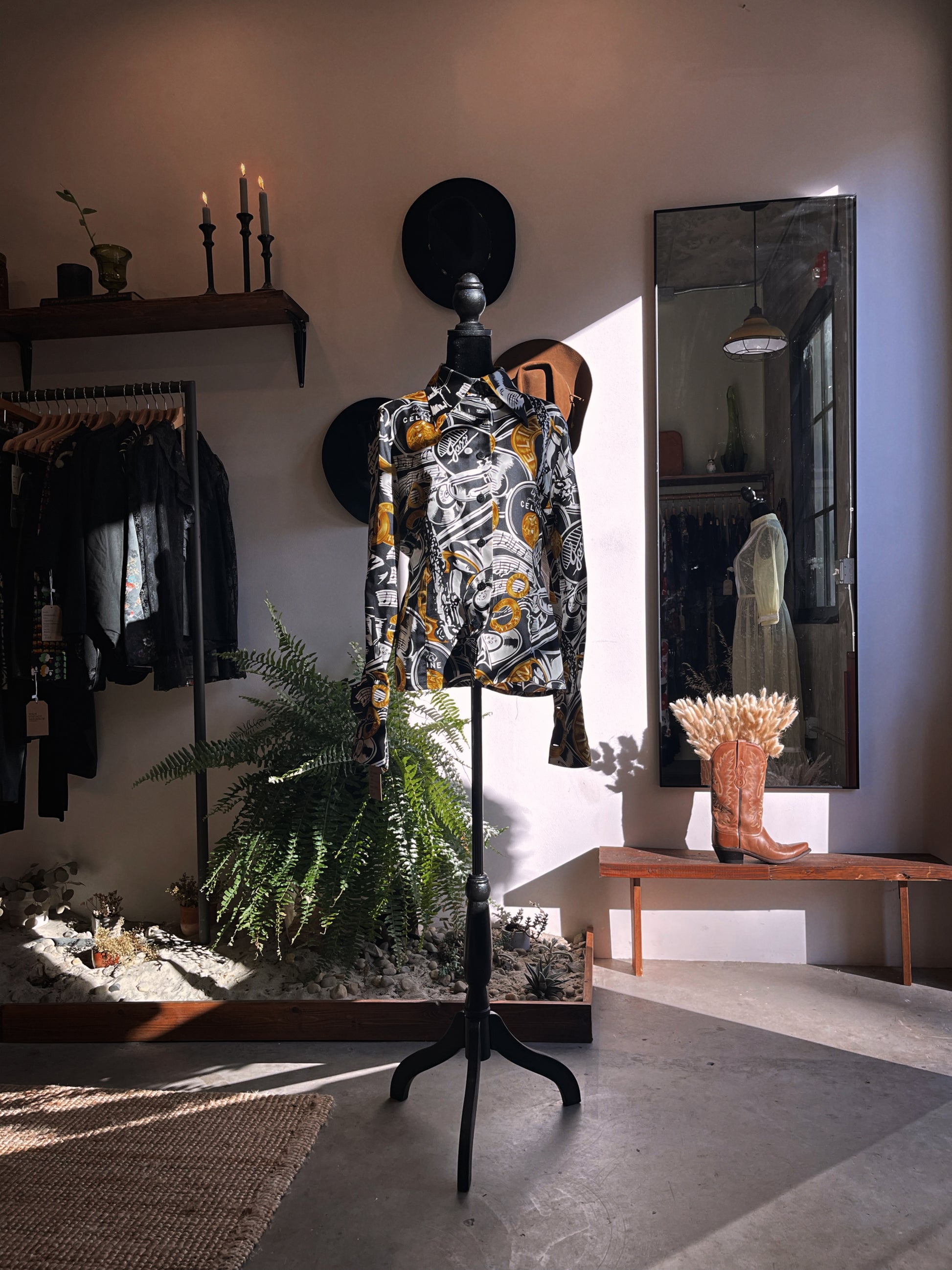 Vintage Celine Paris silk blouse dating from the 1980’s. Features a musical print throughout, long sleeves and buttons to the collar. Excellent condition. Labeled a size 44. Dry clean only. Pit to pit flat 21 inches, shoulder to bottom hem 23.75 inches.