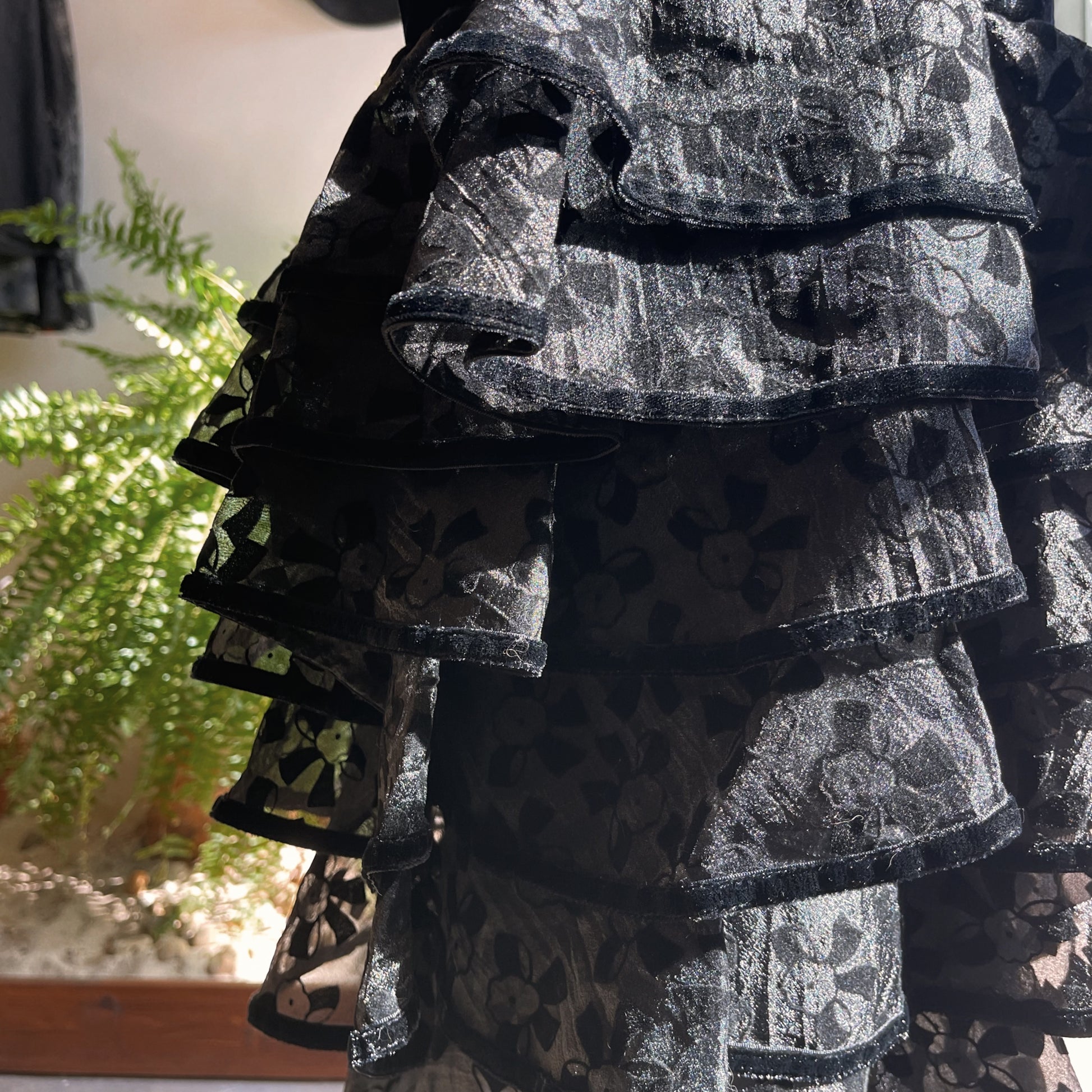 Vintage 1980’s Pat Richard’s velvet flamenco style dress. Feature sweetheart neckline, puff layered chiffon sleeves to be worn off the shoulders, midi length with fitted body and tired chiffon layered bottom. Dry clean only. Pristine condition. Pit to pit flat 16.5 inches, waist flat 14.25 inches, out to bottom hem 39 inches.