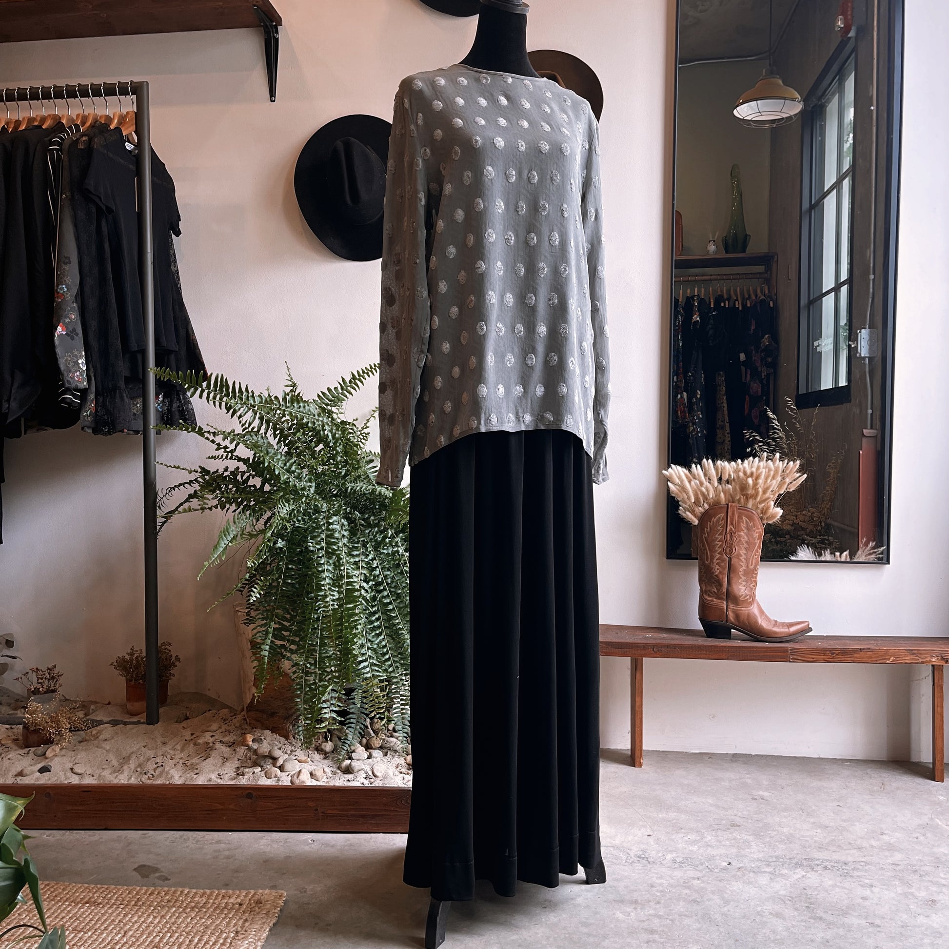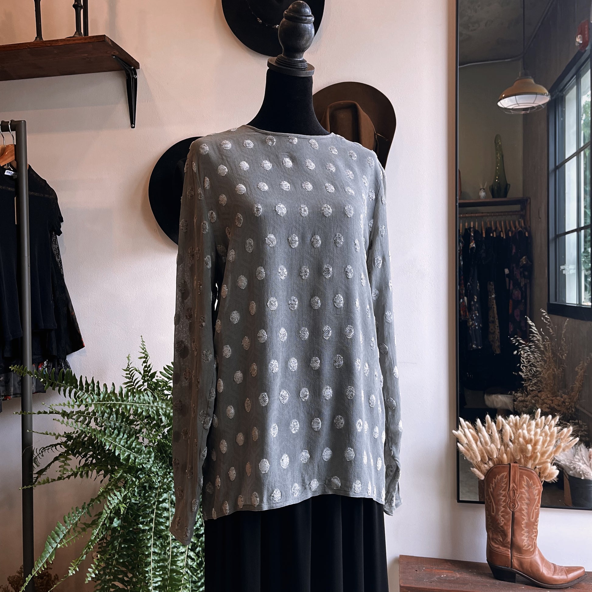 Vintage designer Salvatore Ferragamo Italy long sleeve blouse in grey with texture polka dot print, semi sheer sleeves, key hole back with button closure. Made of viscose, dry clean only. Labeled a size 10.