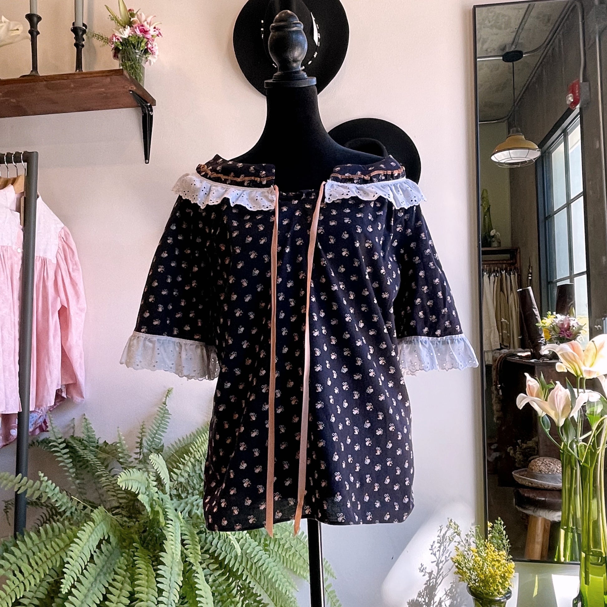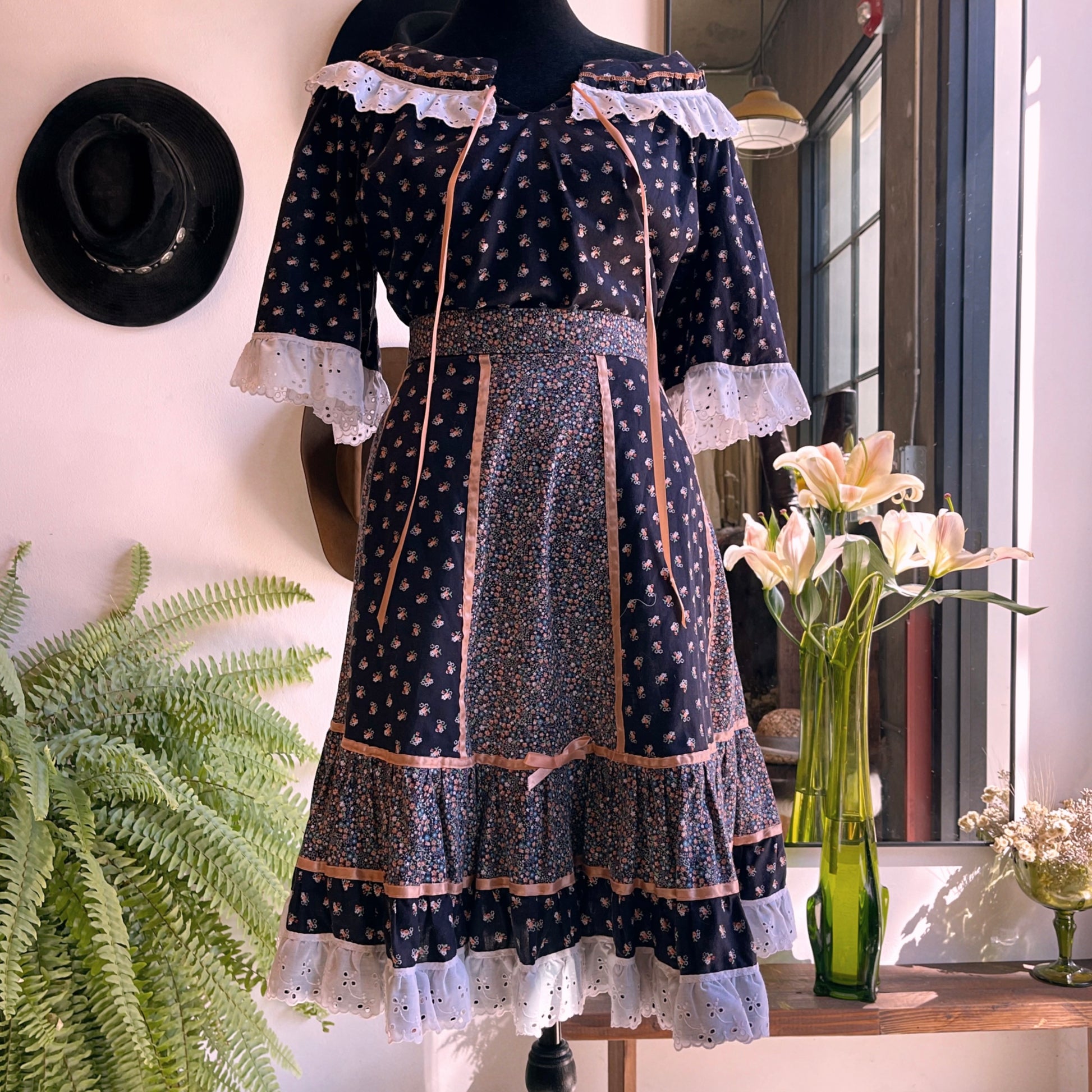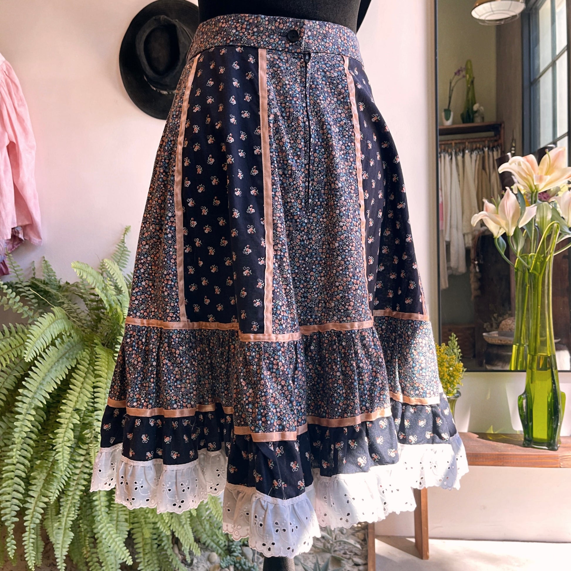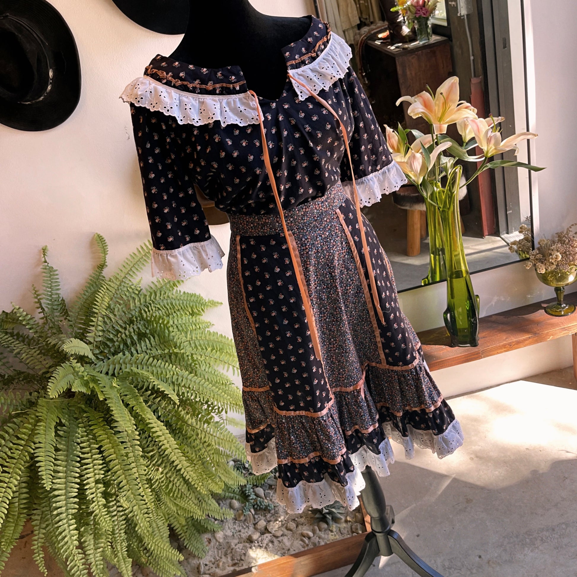 Cute cotton skirt set by Krist Gudnason of California dating from the early 70’s. Navy blue in color with florets print and cotton eyelet lace trim. Prairie style skirt has a zip button closure and top is a slip-on. Like new condition. Skirt waist flat 14.5 inches, length 23.5 inches. Top pit to pit 19.5 inches.