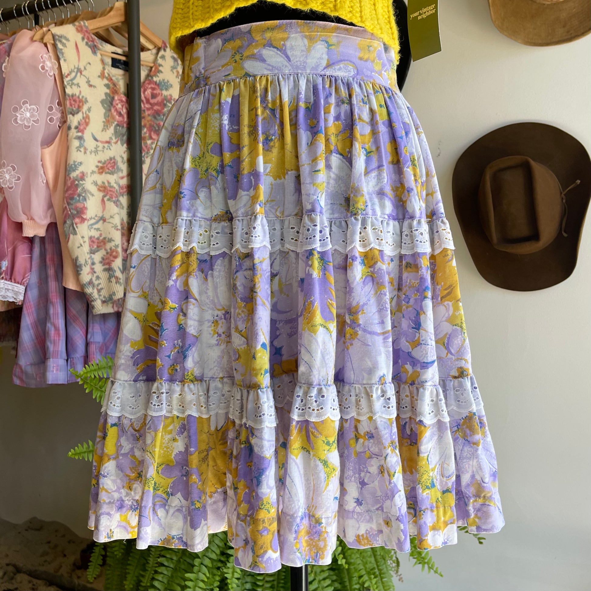 Vintage 70’s floral prairie style skirt by Rockmount western wear. High waisted, lace accents with zip button closure. Best for an extra small. Made of cotton. Waist flat 13 inches, total length 21 inches.