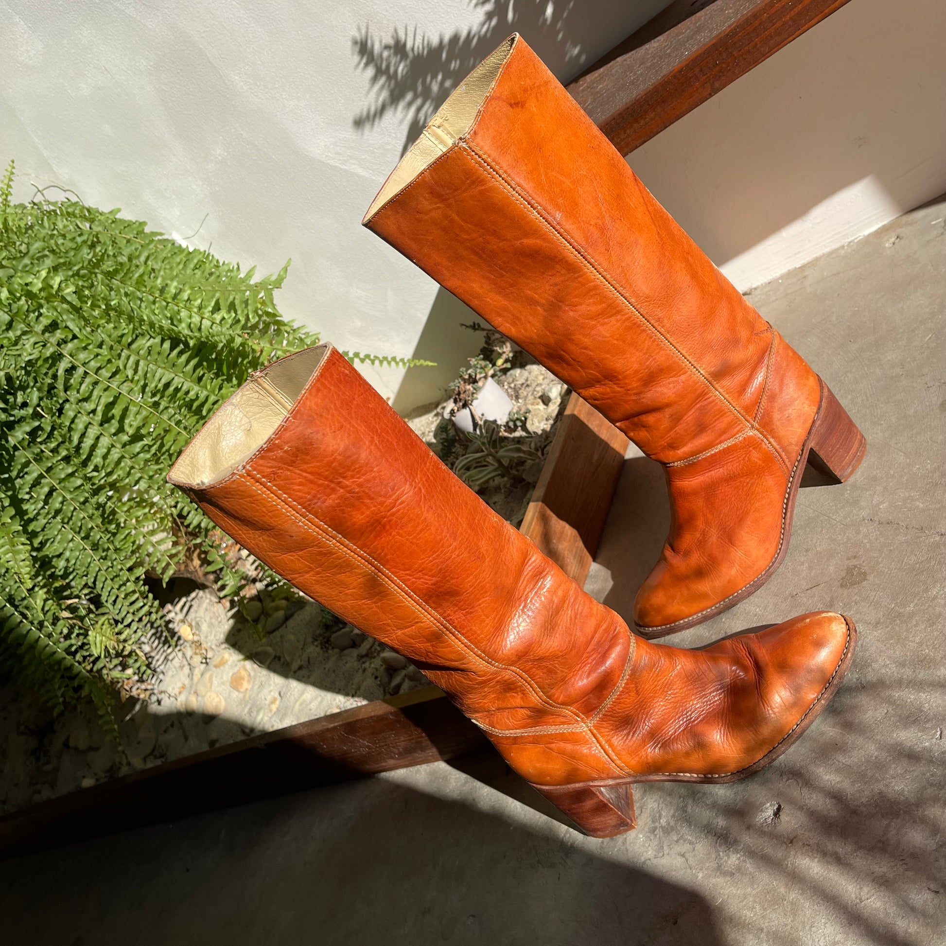 Vintage round toe leather tall boots in saddle brown. Made in Brazil. In great vintage condition.