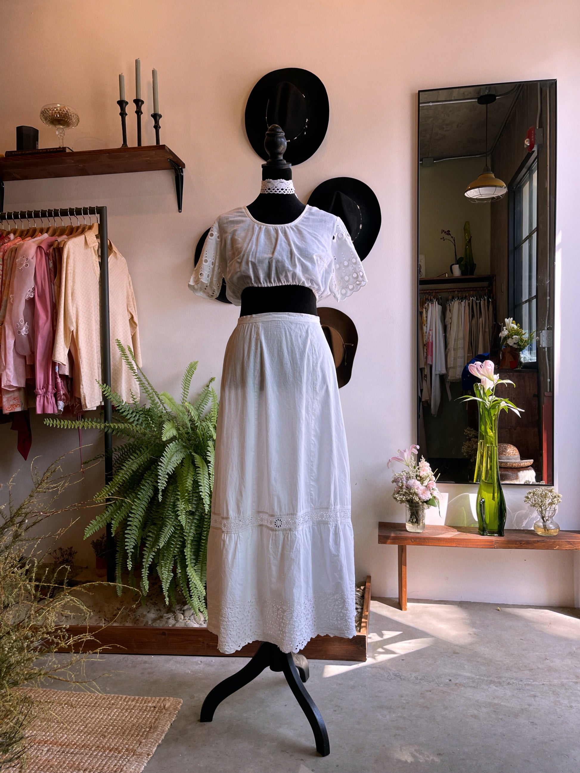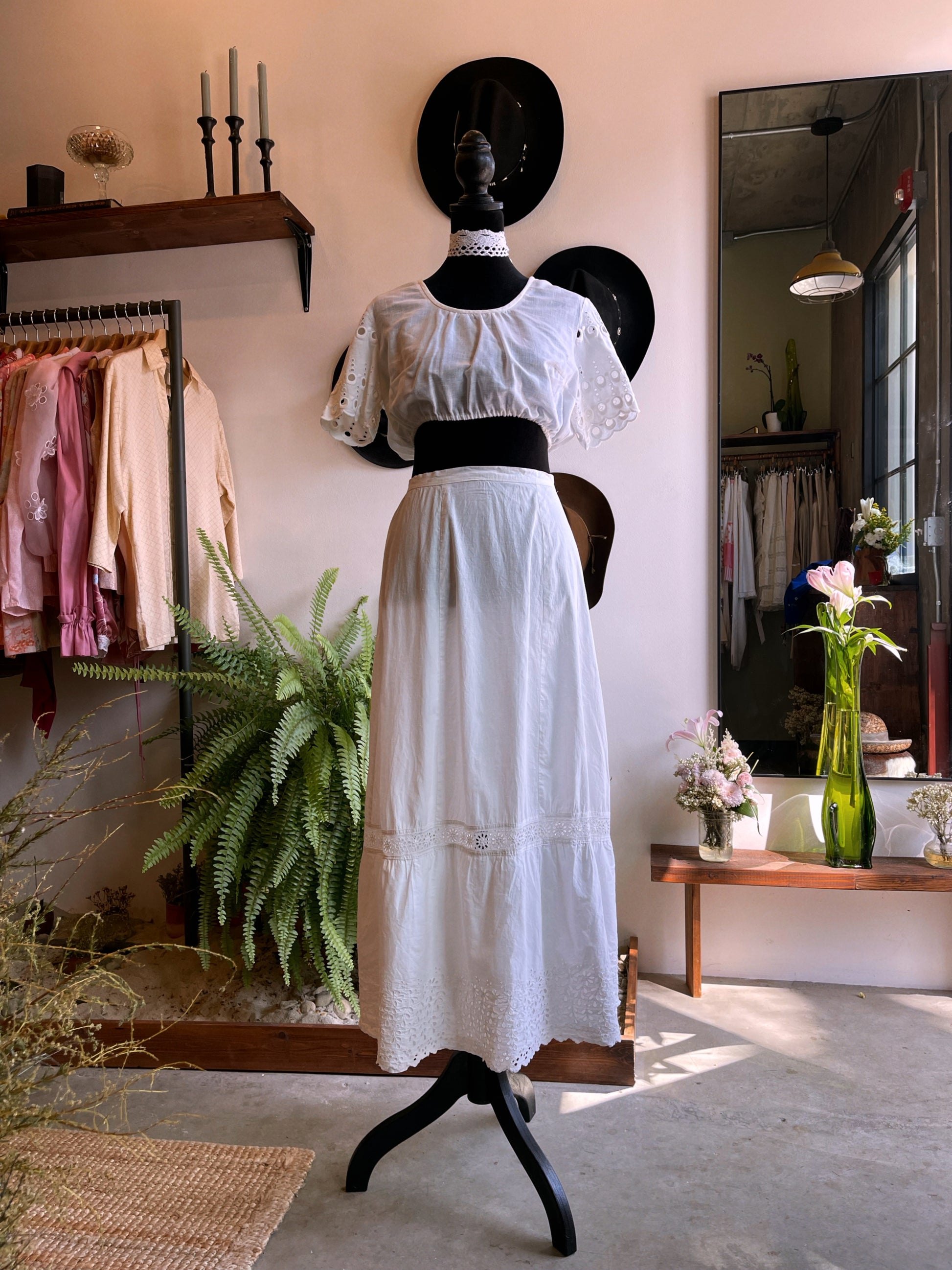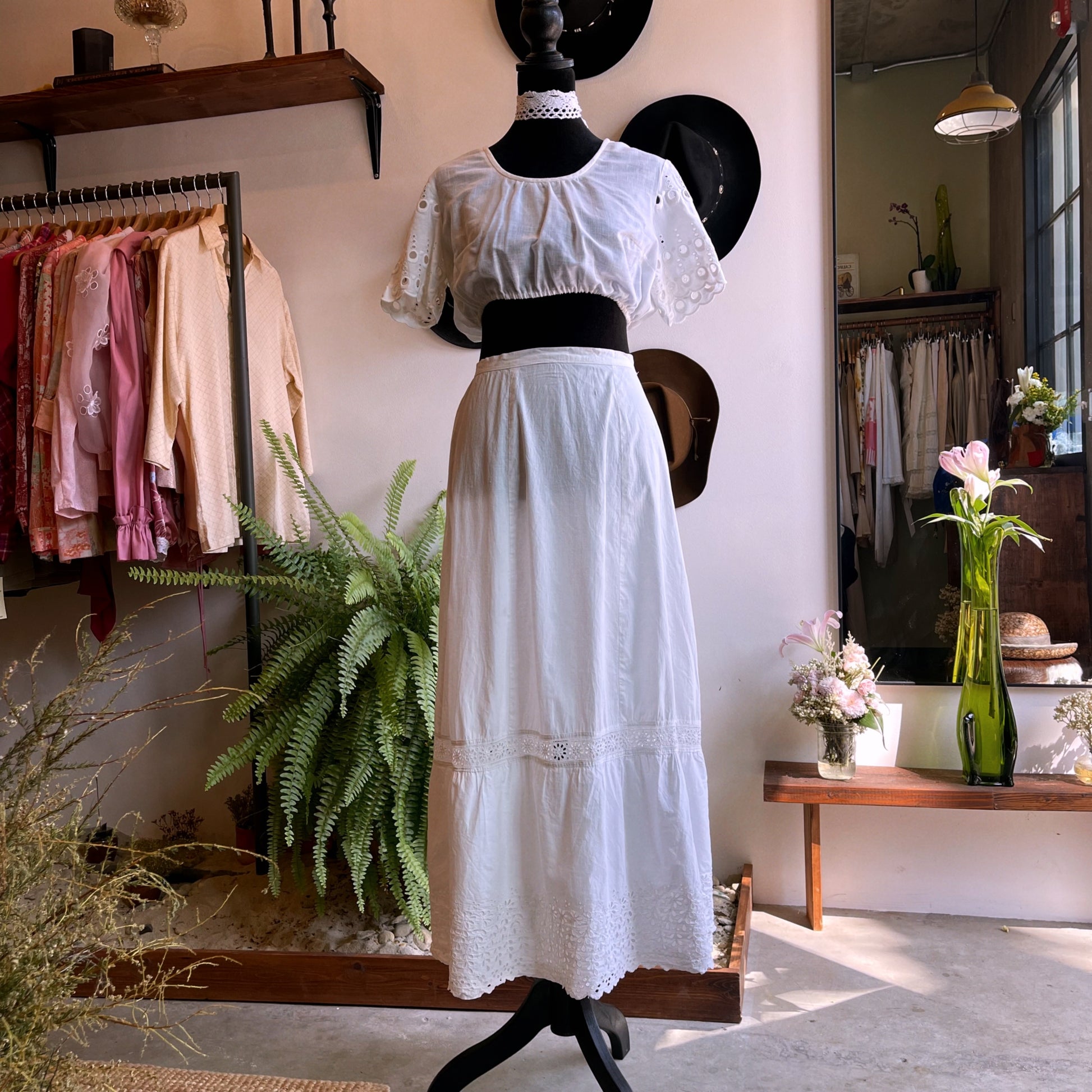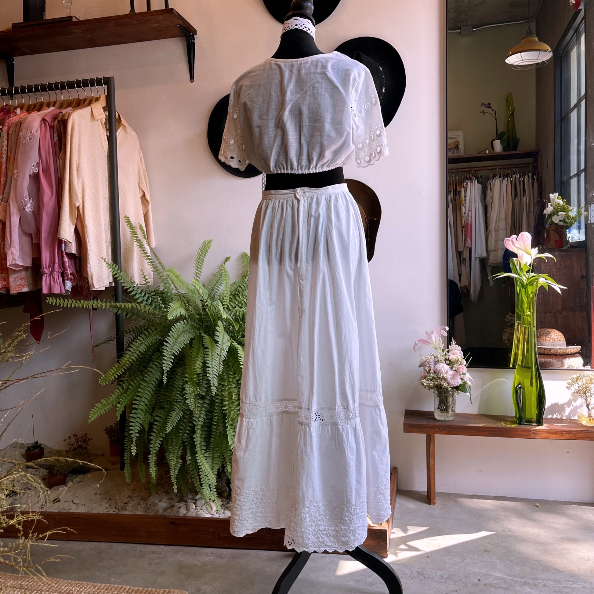 Vintage Antique cotton petticoat. Features high rise, button closure at waist and full length. Excellent condition for age with no holes or stains. Waist flat 14 inches, total length 35 inches.