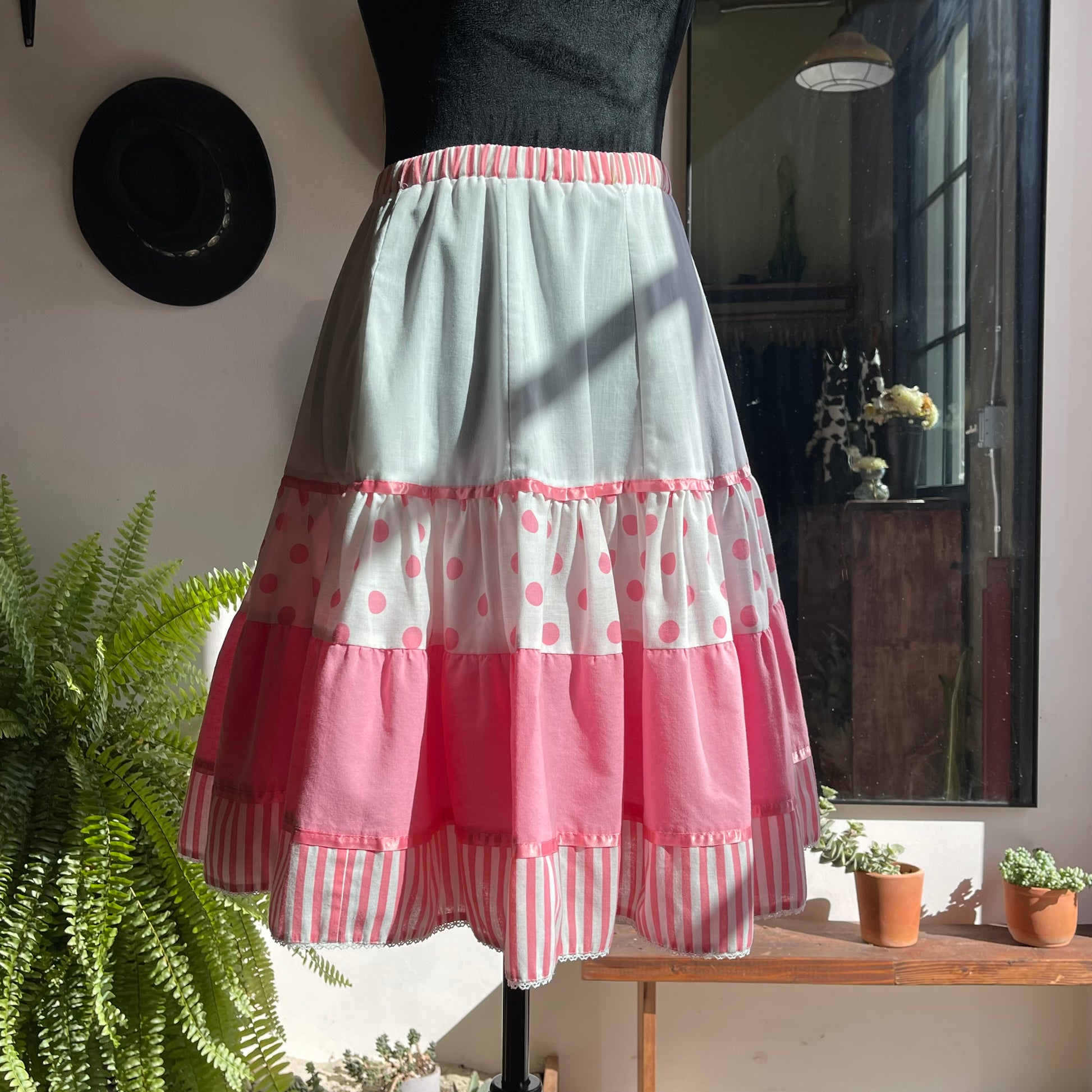 Vintage handmade 60’s polka dot full circle skirt in pink and white. Features an elastic waist band and above the knee length. Like new condition. Waist flat 15 inches, total length 22 inches.